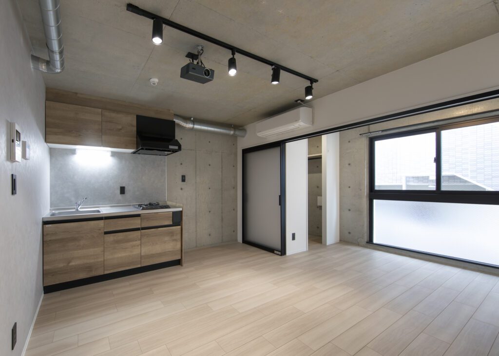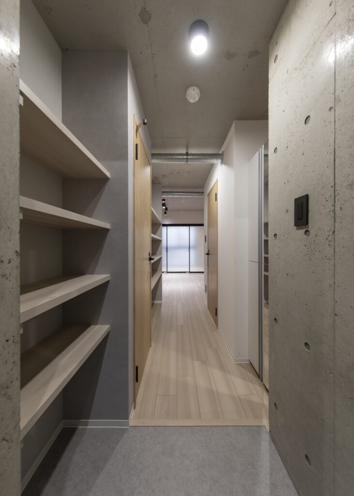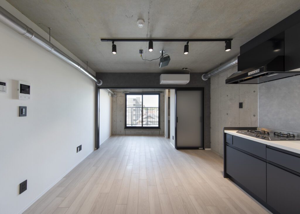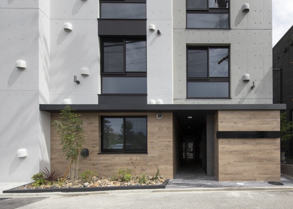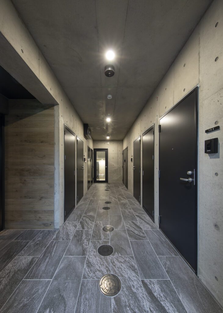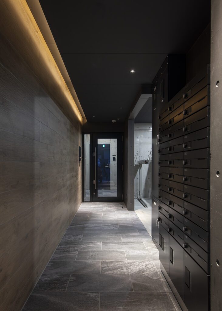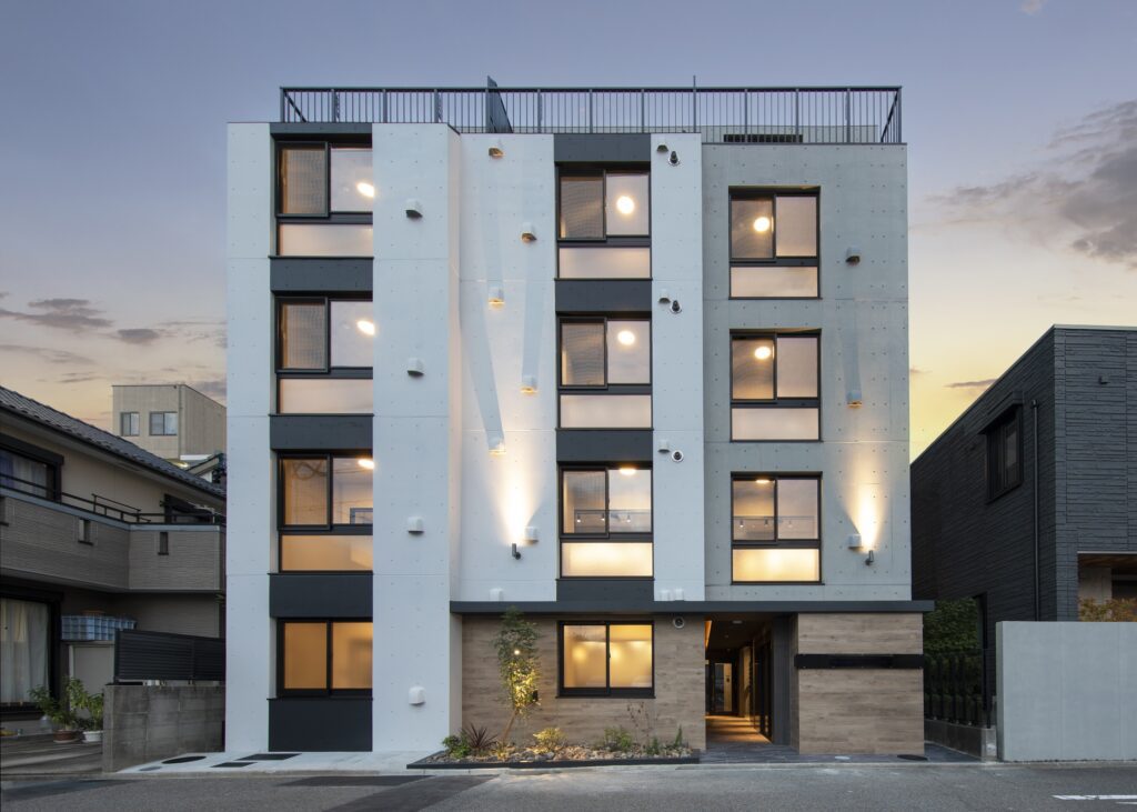 5階建ての新築マンション。 外観・内観ともにコンクリートの質感を生かしたデザインで、無機質でありながら洗練された印象を与えます。 住戸にはメゾネットタイプも採用し、階段を備えた開放的な空間構成が特徴です。 共用部のエントランスには上質な石材を使用し、訪れる人を上品に迎え入れます。 夜には照明が建物をやわらかく照らし出し、シックで落ち着いた雰囲気を一層際立たせます。